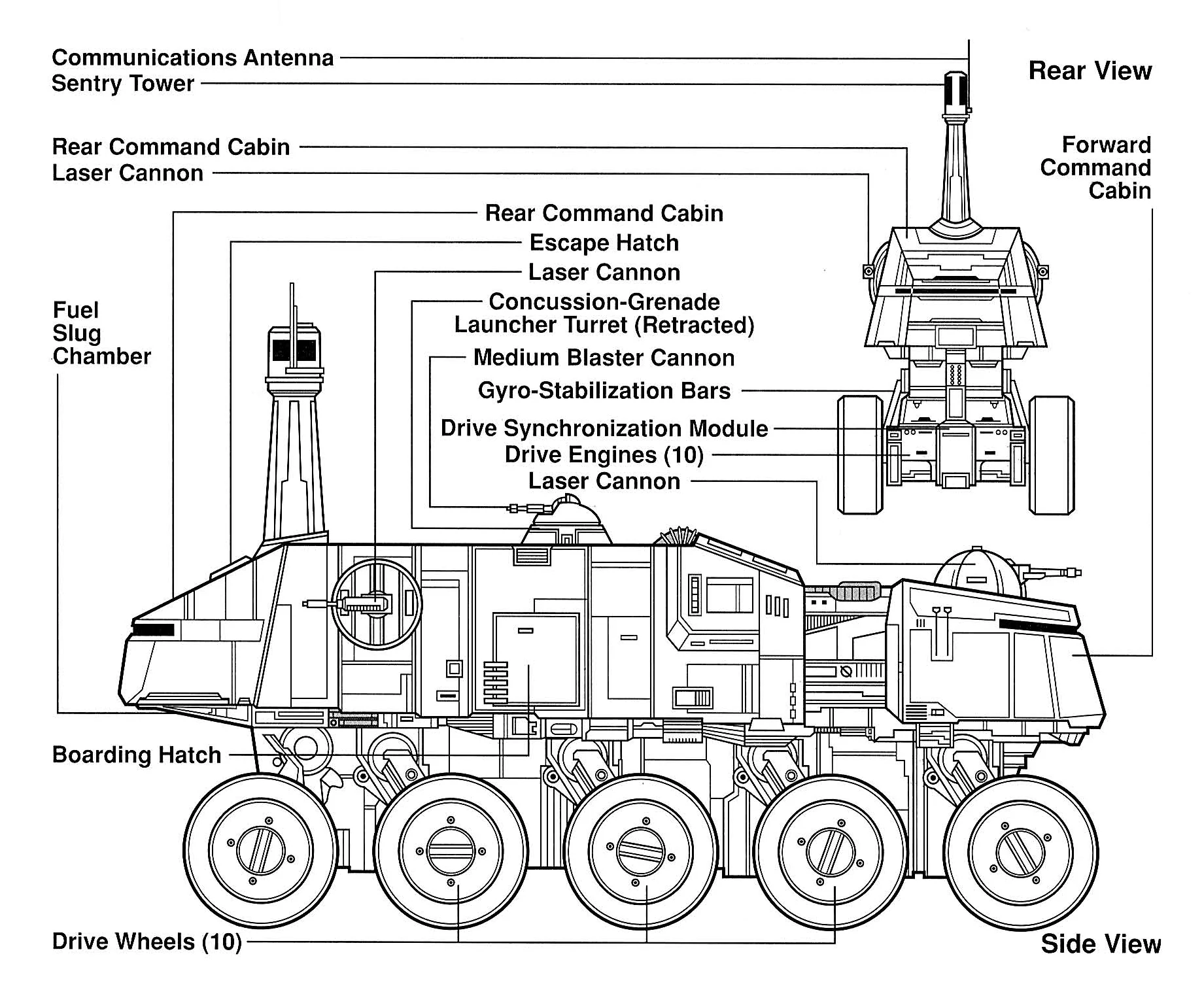 Designed and built by Kuat Drive Yards, the HAVw A5 Juggernaut was a 21.8 meter long[2] wheeled assault vehicle.[1] The main body of the A5 stood ten meters tall, with the separate sentry tower increasing the overall height of the Juggernaut to nearly fifteen meters.[3] Equipped with thick, nearly impenetrable armor, the A5 incorporated dual control cabins, one located at either end of the vehicle. As a result, the A5 was steerable from either end, and the wheels were independently steerable from either control cabin. The dual steering control system was required due to the amount of time required to turn the vehicle completely around; in situations requiring the vehicle to reverse course, it could simply be driven from the other end of the vehicle.[1]