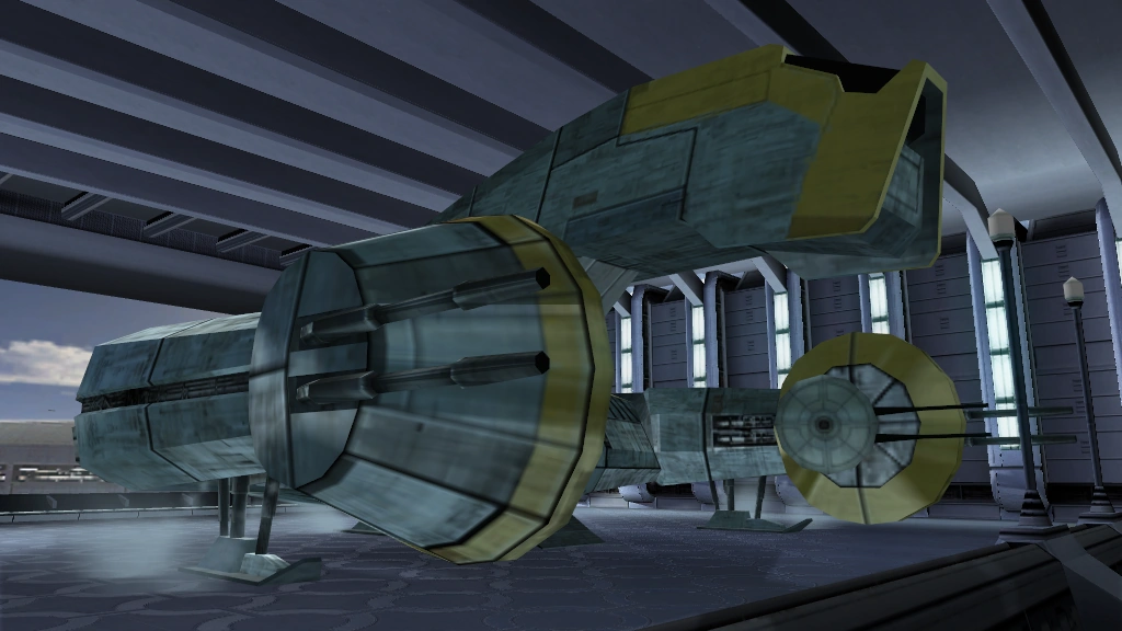 Originally designed by Kellenech Technologies, a droid manufacturer, this ship was supposed to carry its military and construction droids. But when it bankrupted, the Galactic Republic took the design and began production of the ships through Republic Fleet Systems. However, after the Great Sith War the funding stopped and a variety of manufacturers was contracted to finish the vessels for military and commercial use.