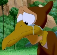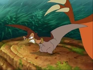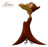 Petrie (a.k.a. Panicky Petrie), originally voiced by the late Will Ryan and later by Jeff Bennett, is one of the original main characters in The Land Before Time franchise. He is the tritagonist in The Land Before Time, a major character in the sequels, and the main protagonist of The Land Before Time XII: The Great Day of the Flyers. He is also one of only three characters to appear in every movie and TV episode. He is a type of pterosaur known as a Pteranodon, which is one of many creatures called a "flyer" by the characters in the series. When the main characters are listed in order, Petrie is usually listed between Ducky and Spike, but if Spike is listed immediately following Littlefoot and Cera, Petrie is listed after Ducky but before Chomper and Ruby.